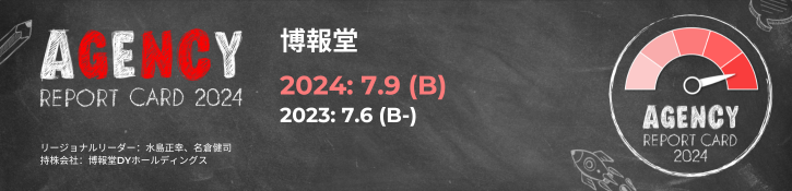 B+: 2024年は博報堂にとって、変革と前進の年となった。新中期経営計画の初年度にあたり、今後3年の目標を達成するため国内外で事業構造の変革を実施。多様性をより反映したリーダーシップ体制への再編、次世代の女性管理職を育成する研修プログラムの新設などに取り組んだ。目覚ましく進歩したテクノロジー主導のソリューションを社内外で適用し、マーケティングサービスの拡大と、収益の大幅な成長に寄与した。クリエイティブは世界的に高く評価され、権威ある国際広告賞で多数のグランプリを受賞し、TBWA HAKUHODOはロンドン・インターナショナル・アワード2024においてアジアの「リージョナル・エージェンシー・オブ・ザ・イヤー」を獲得した。最後に、博報堂は持続可能な地球環境にさらに貢献できるよう、サステナビリティーの取り組みに確固たる姿勢で臨み、数多くの気候変動対策や社会貢献活動を実施している。