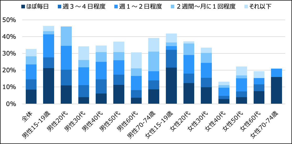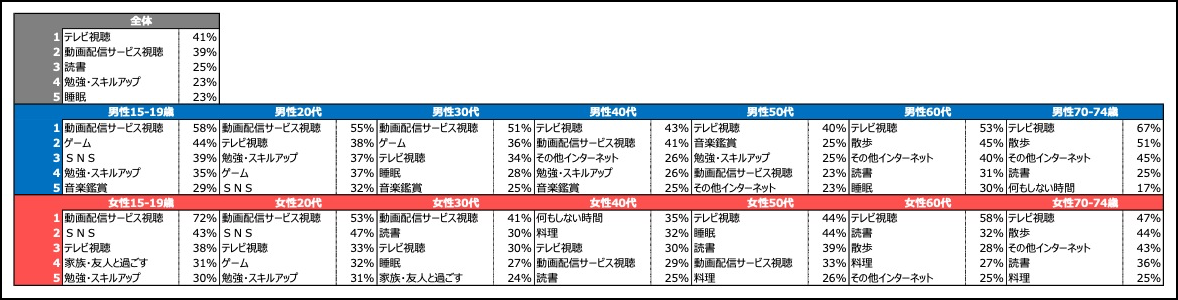 自由時間が増えたと感じる人にその使い方を尋ねると、最も多かったのは「テレビ視聴」(41%)。次いで「動画配信サービス視聴」(39%)、「読書」(25%)、「勉強・スキルアップ」「睡眠」(共に23%)と続いた。ただし年代別で見ると30代以下で最も高かったのは「動画配信サービス視聴」。男性では50%以上、女性でも15〜19歳は72%という高い数値だった。40代以上の男性では「テレビ視聴」がトップ。また、30〜60代の女性では「料理」「睡眠」「読書」などメディアを伴わない生活行動に時間を費やす傾向が見られた。