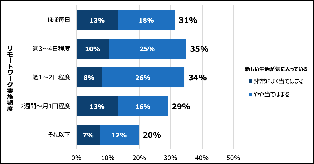 また、リモートワークに関しては週に1日以上実施している人が24%。それらの人の3割強が「新しい生活に満足している」(『まあまあ満足している』も含めて)と答えた。