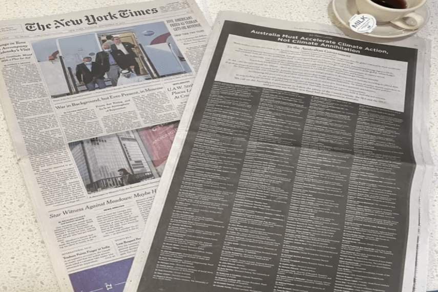 豪州の政策シンクタンク「オーストラリア研究所(The Australia Institute)」が米ニューヨーク・タイムズに、気候変動対策に関する全面広告を出稿した。先日開催された国連総会や気候サミットに合わせて掲載された「気候の破壊ではなく、気候変動対策を加速させるべき」という見出しの広告には、科学者220名超の署名が並ぶ。豪州政府に対し、化石燃料産業での新たな承認と補助金を停止するよう求める内容になっている。