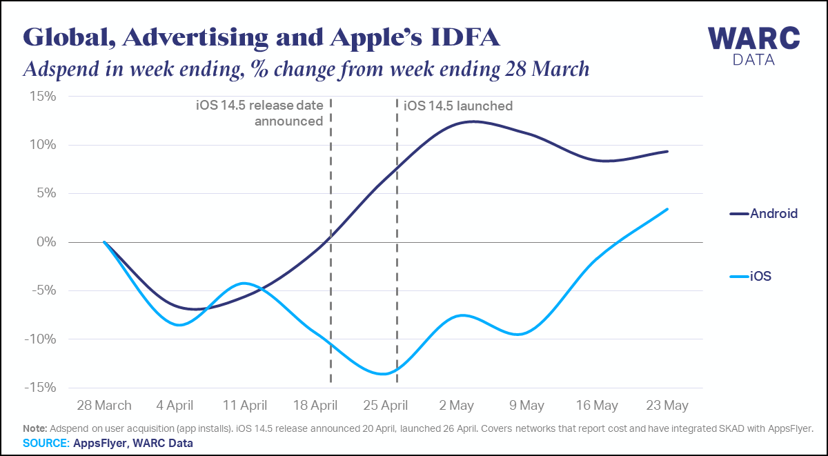 アップル社がプライバシー保護を重視し、ユーザー追跡機能を制限した最新のiOSを4月末にリリースして以降、iOSへの広告費が減っていることが、WARCとアップスフライヤー(AppsFlyer)の調査で明らかになった。その一方で、Androidの広告費は大幅に増加している。