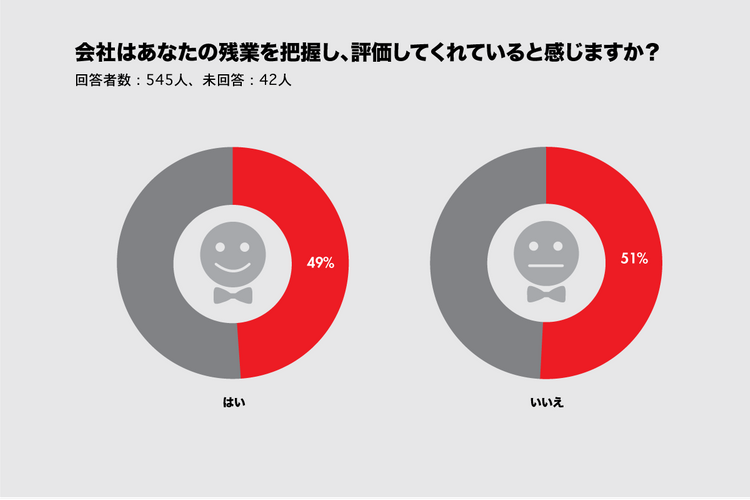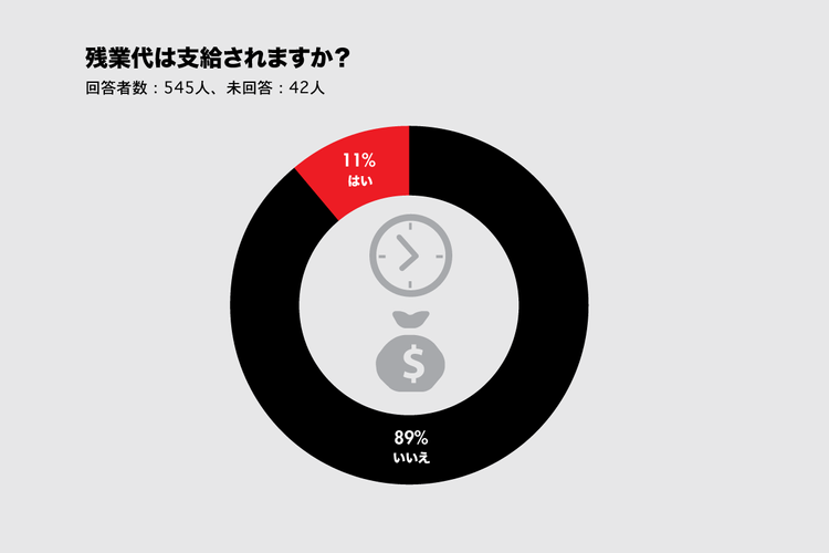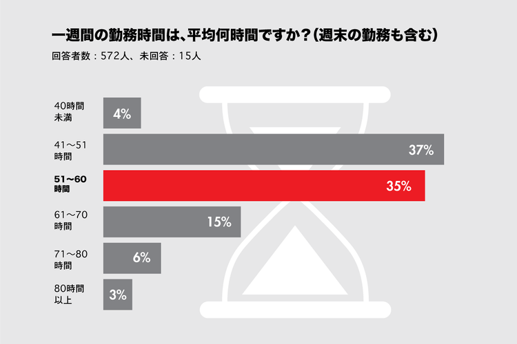 調査結果は、広告界の実情を雄弁に物語るものとなった。回答者の半分以上が「自分は働き過ぎている」と感じており、約3分の2が一週間あたりの労働時間が平均40時間を上回っている。残業代が支給されず、休日も仕事をしているという回答者は9割近くに上る。