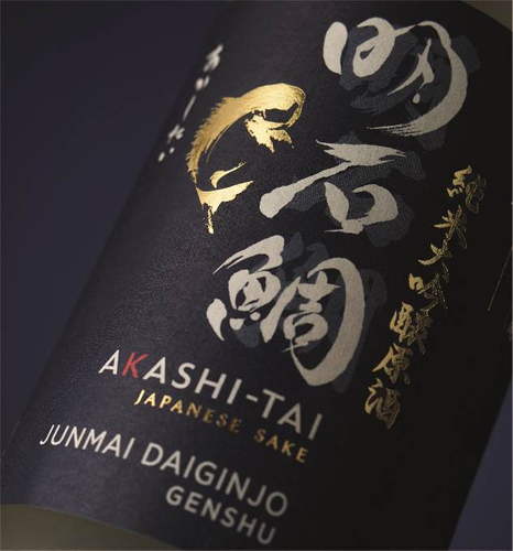 「魚の王様」といわれる鯛の中でも、特に「鯛の王様」と呼ばれる明石鯛。これに負けないお酒にしようという思いで命名された同ブランドにとって、鯛は欠かせないモチーフだ。新しいラベルデザインにも鯛は描かれているが、以前よりも書道らしさを前面に押し出したものへと変更された。デザインを担当したのはフランスのアーティスト、オロール・ドゥ・ラ・モリヌリ氏で、書は平野壮弦氏(書道家)によるもの。