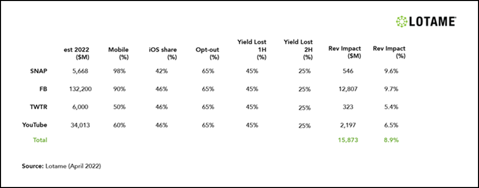 データブロッキングと、アップルが導入した「ATT(App Tracking Transparency)」のインパクトが、SNS大手4社が被る影響を予測する上で重要な役割を担うだろうと、LOTAMEのレポートは指摘する。LOTAMEは当初、80%のアクセスが全面的にブロックされると予測していたが、この数字を下方修正し、65%のオプトアウト率に落ち着きそうだとしている。
