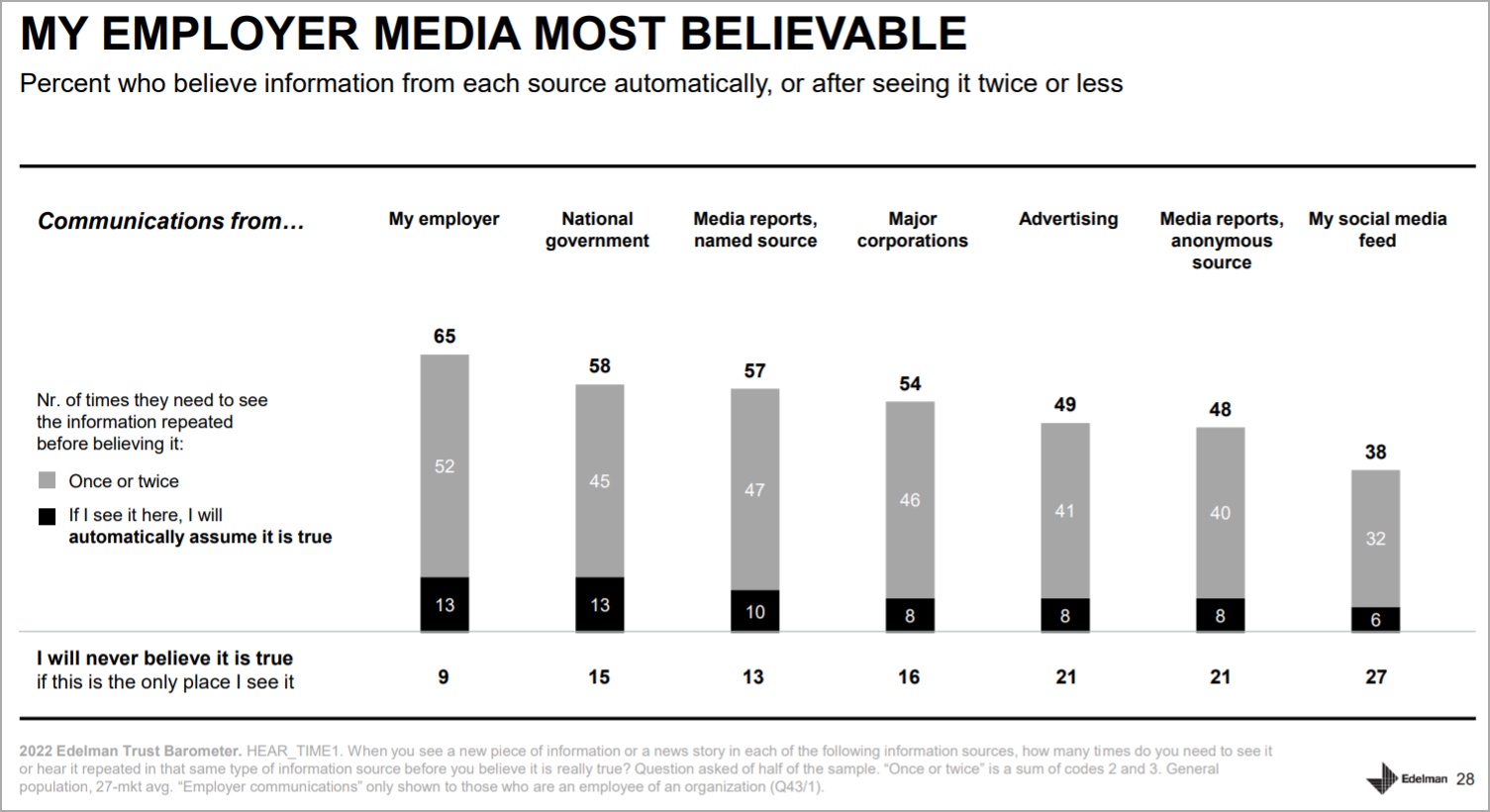 即座に、あるいは1~2回で信じる情報源として、回答者が最も信頼を寄せるのは雇用主(65%)だ。以降に政府(58%)、出典の明らかなメディア報道(57%)、大手企業(54%)が続く。