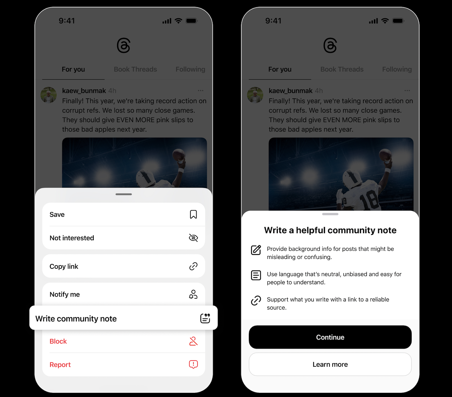 同社のブログによると、米国在住の18歳以上が登録でき、フェイスブック、インスタグラム、スレッズの投稿に対して注釈を付けられるようになる。論拠となるリンクを添えて500字以内で書き込み、有益な情報であると他のユーザーから評価されれば公開される仕組みだ。