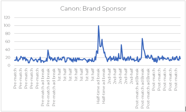 この図はエンゲージメントのピークの時間と、スポーツイベントにおけるブランドと視聴者との関係性を明確に示している。テレビ広告を受けて視聴者がスマートフォンやノートパソコン、タブレットを使ってオンラインに殺到、キヤノンに関する検索をしていることがよく分かる。