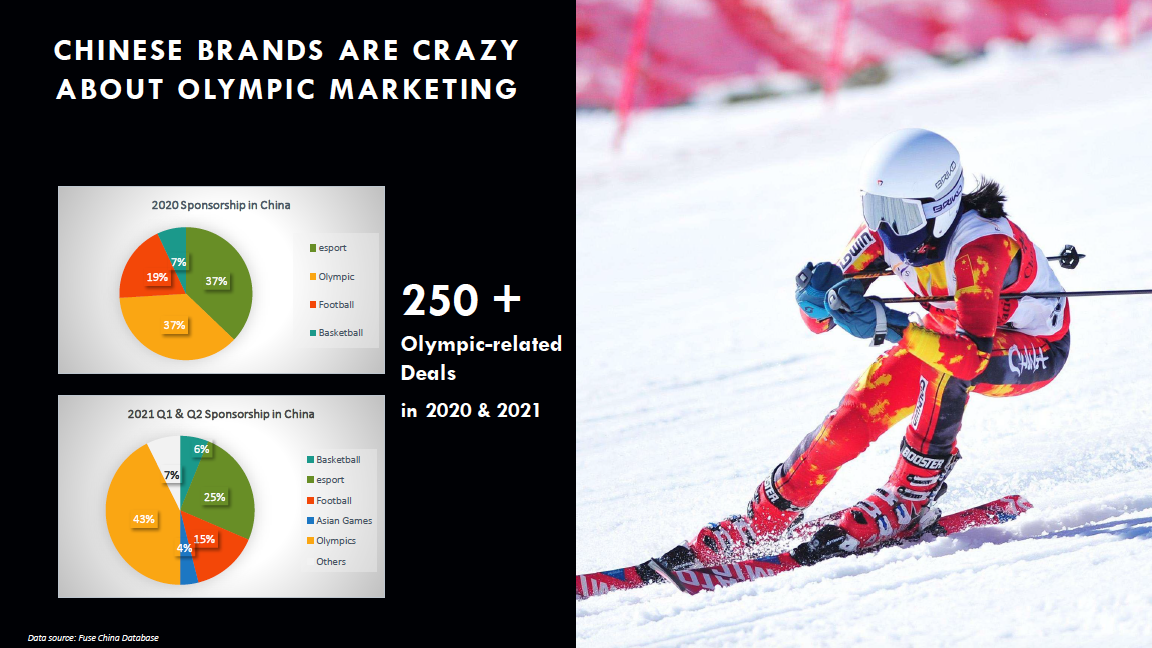 中国ブランドもそれに呼応し、2015年から19年にかけてスポンサー支出は年平均で8.9%増加。2020年から21年には250件に及ぶ五輪関連の契約が成立し、中国でのeスポーツ人気を追い越した。フューズによれば、45以上の中国ブランドが北京冬季五輪のオフィシャルパートナーやスポンサー、サプライヤーとして契約を交わしたという。