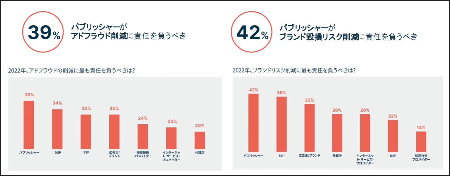 ブランド毀損リスクに関しては、コネクテッドTV(CTV)環境におけるブランドリスクは「CTV在庫量とCTV販売数の増加につれて増していく」(71%)。モバイル環境やソーシャルメディアのブランドリスクに対する脆弱性も懸念されている(それぞれ50%、26%)。こうした状況から、「第三者による検証が重要」とした回答者はモバイル環境で71%、デジタル動画環境では79%に上った。また、アドフラウドやブランドリスクの削減に関して「最も責任を負うべきはパブリッシャー」という意見が多かった。