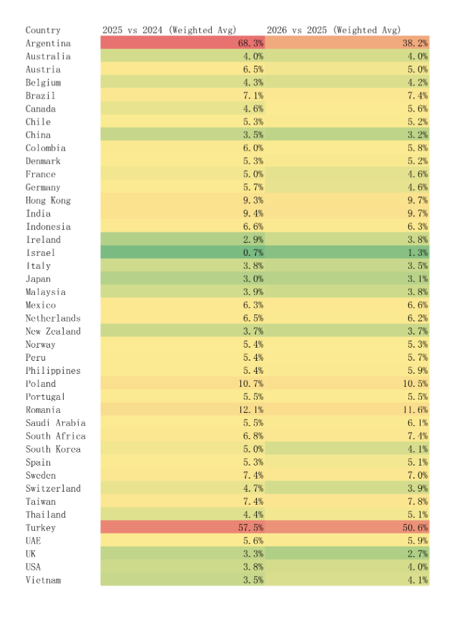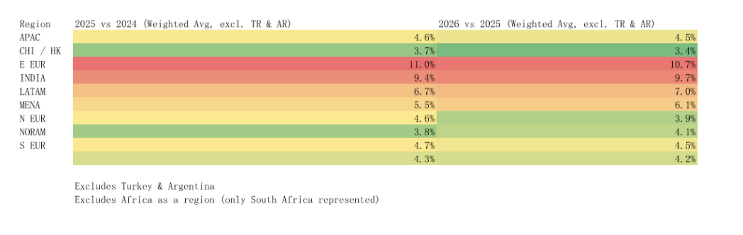 APACに比べ、東欧(11%)とラテンアメリカ(6.7%)の上昇率は高い。西側諸国の成熟市場は3~4%と抑制傾向。例えば、米国では2025年に約3.8%、2026年には約4.0%と小幅な上昇が見込まれる。英国では上昇率が若干低いものの、物価上昇が警戒要素になっている。