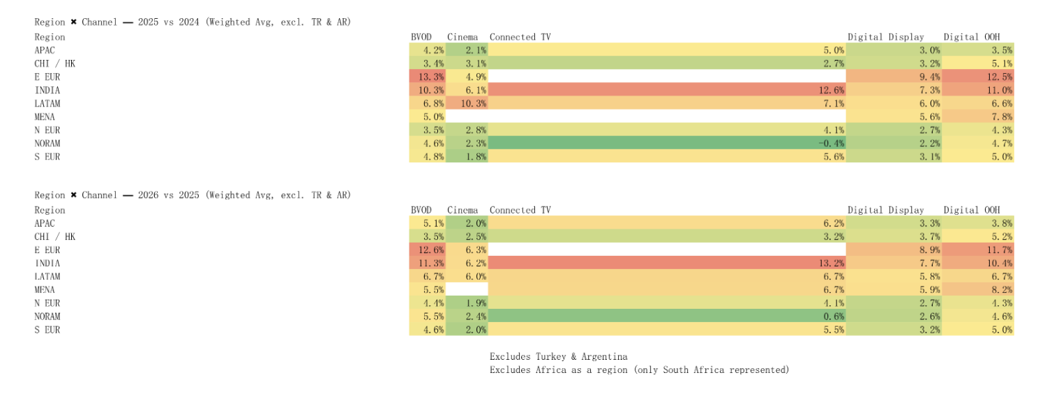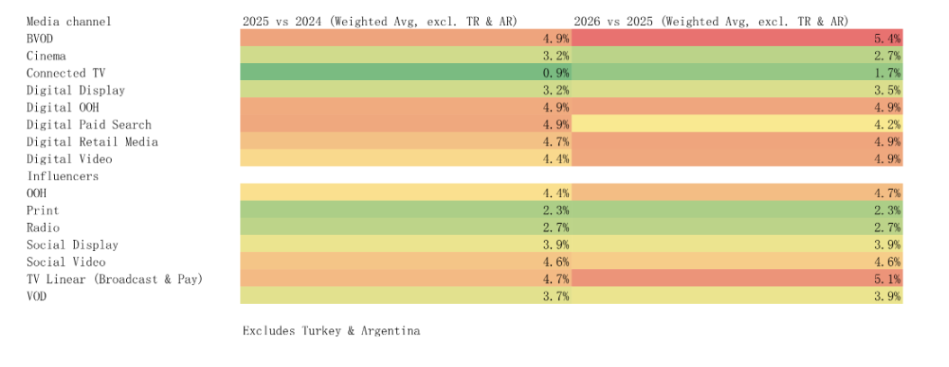 映画やデジタルディスプレイ、デジタルOOH、印刷物などのチャネルは市場ダイナミクスの差異を反映し、概ね低い上昇率(2%~4%)だった。